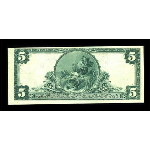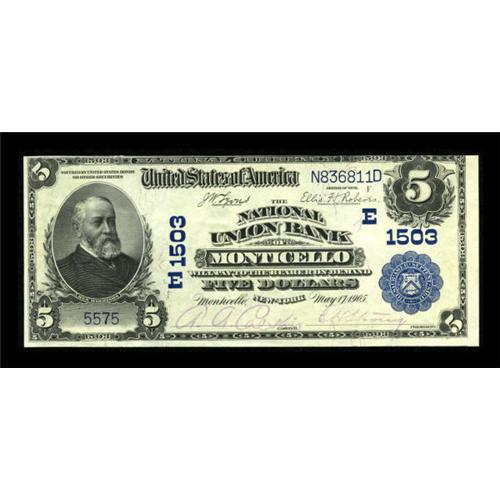 <B>Monticello, NY</B></I> - $5 1902 Plain Back Fr. 598 <B>The National Union Bank</B></I> Ch. # (E)1503<BR> A high grade example from this Sullivan County bank. There is one small margin split at the bottom and the top margin is close, but those small problems are more than offset by the note's bright and fresh appearance. <B>Extremely Fine.</B></I><BR><I>From The Thomas A. Bergin Collection</B></I><BR><BR><b>Shipping:</b> Coins & Currency (<a target="_blank" href="http://www.heritageauctions.com/common/shipping.php">view shipping information</a>)