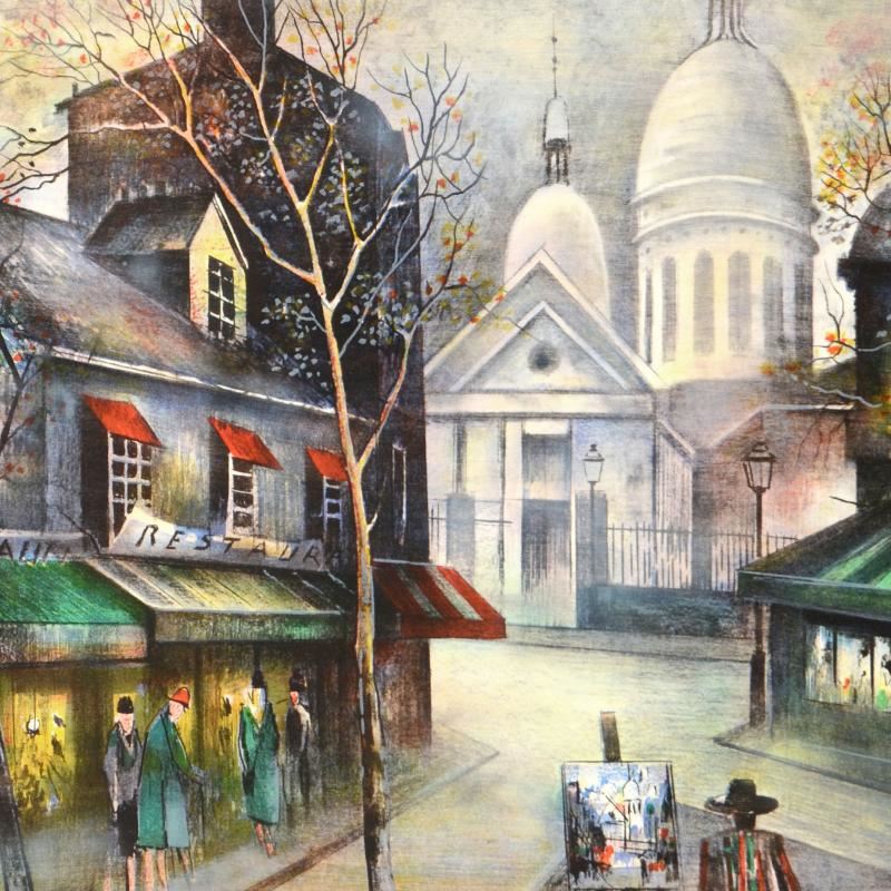 "Montmarte" is a limited edition lithograph on paper by Antonio Rivera, numbered and hand signed by the artist! Measures approx. 29" x 21" (border). 26.5" x 17.5" (image).