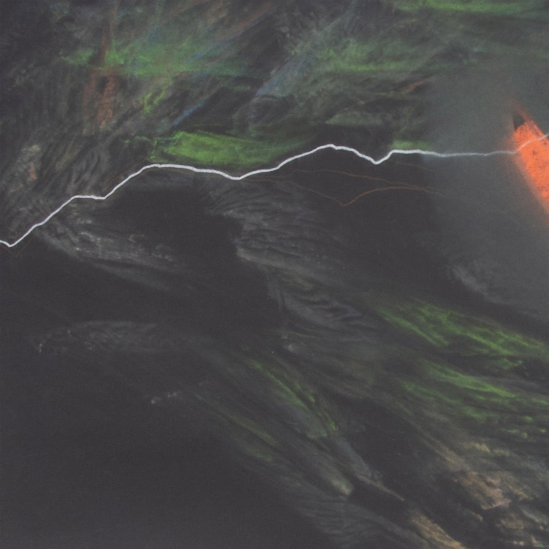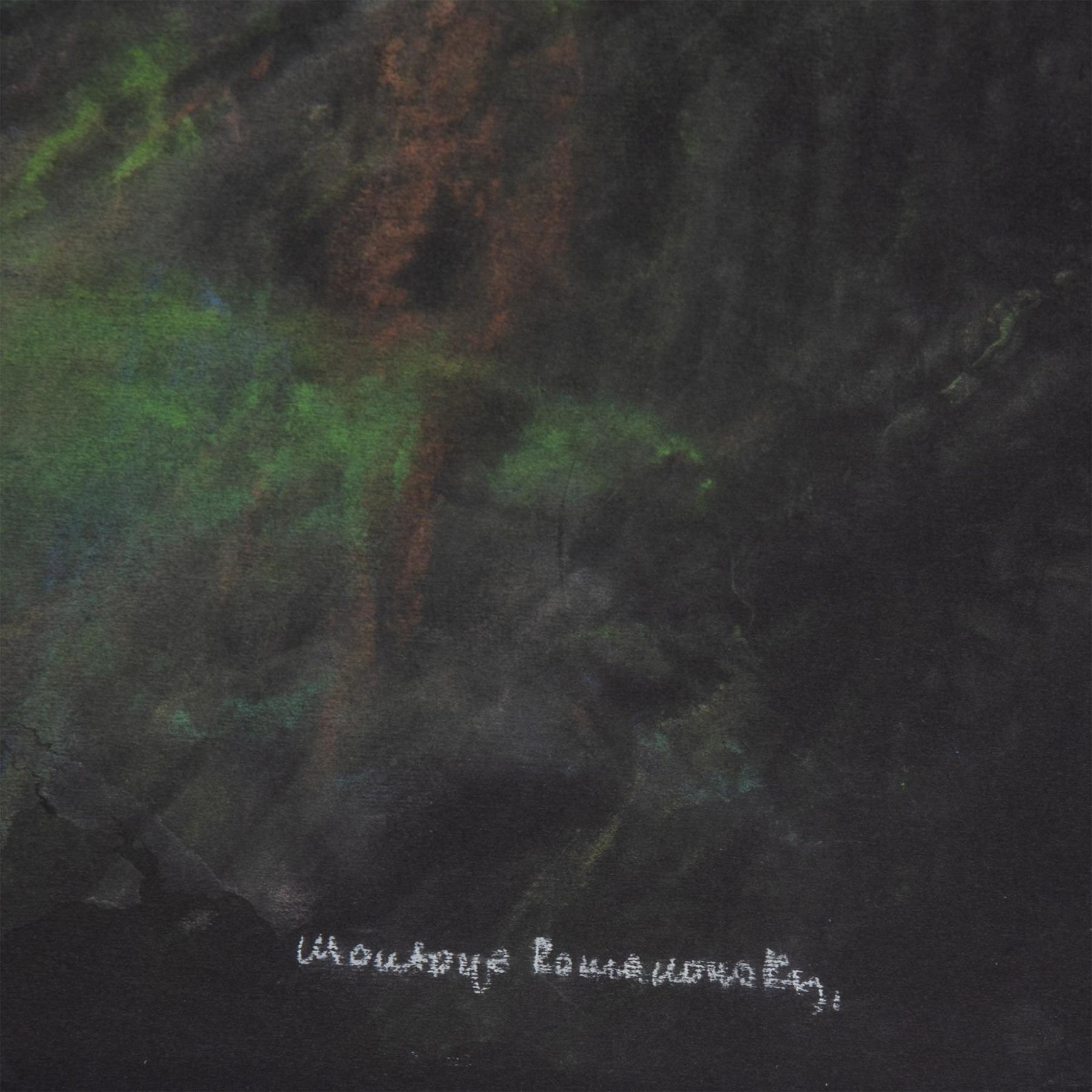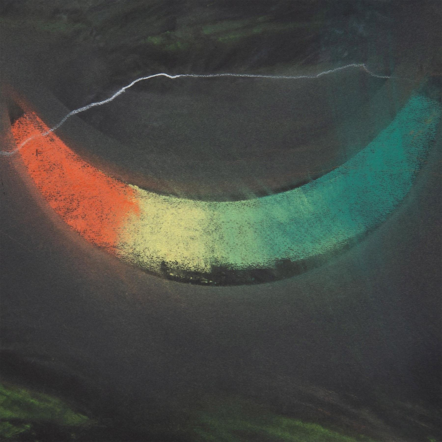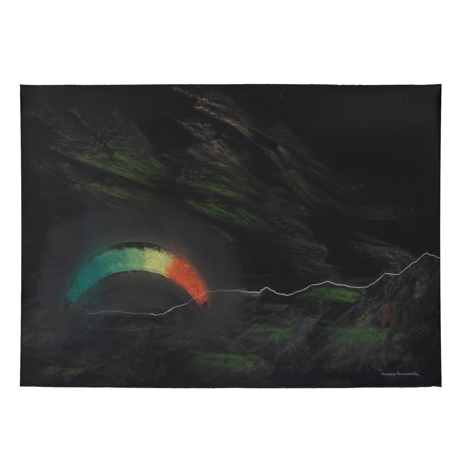 Rarely offered large chalk pastel on black laid paper by Colombian figurative and landscape artist Montoya Romanowsky. He has drawn an abstracted landscape where a rainbow reflects orange, yellow and green shades onto the earth and the night sky.