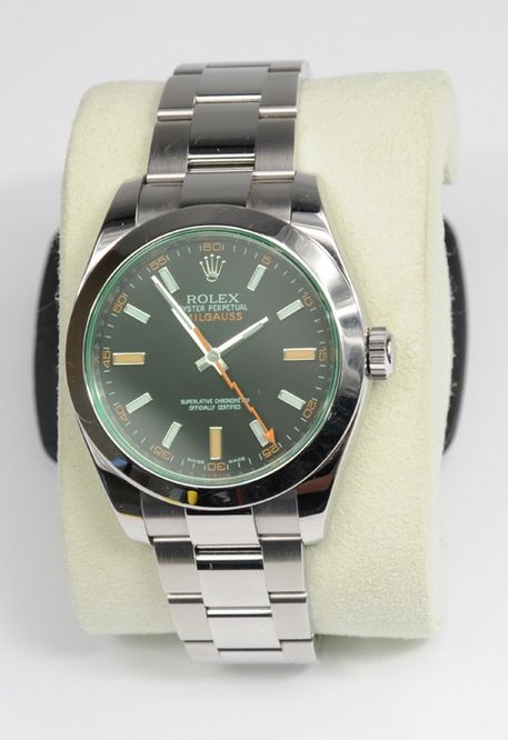 Rolex oyster perpetual Milgauss pour homme, modèle 2009 numéro de référence : 116400GV et numéro de série : V750067. Cette montre est conservée dans sa boîte originale avec tous les documents