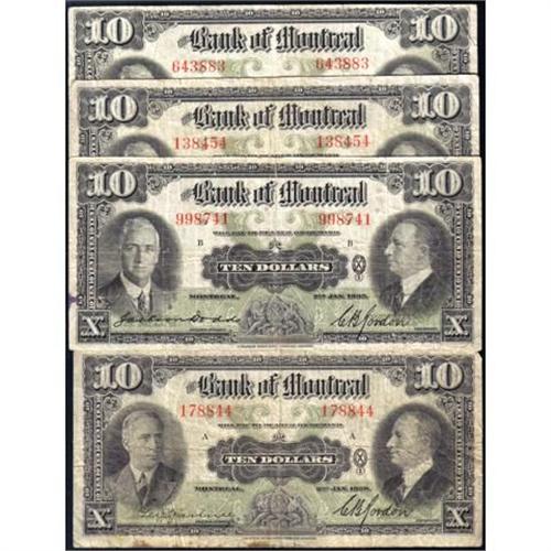 Bank of Montreal Ten Dollars 1935, CH-505-60-04, three notes, VG and Fine, one with problems. Plus Bank of Montreal Ten Dollars 1938, CH-505-62-04, VG