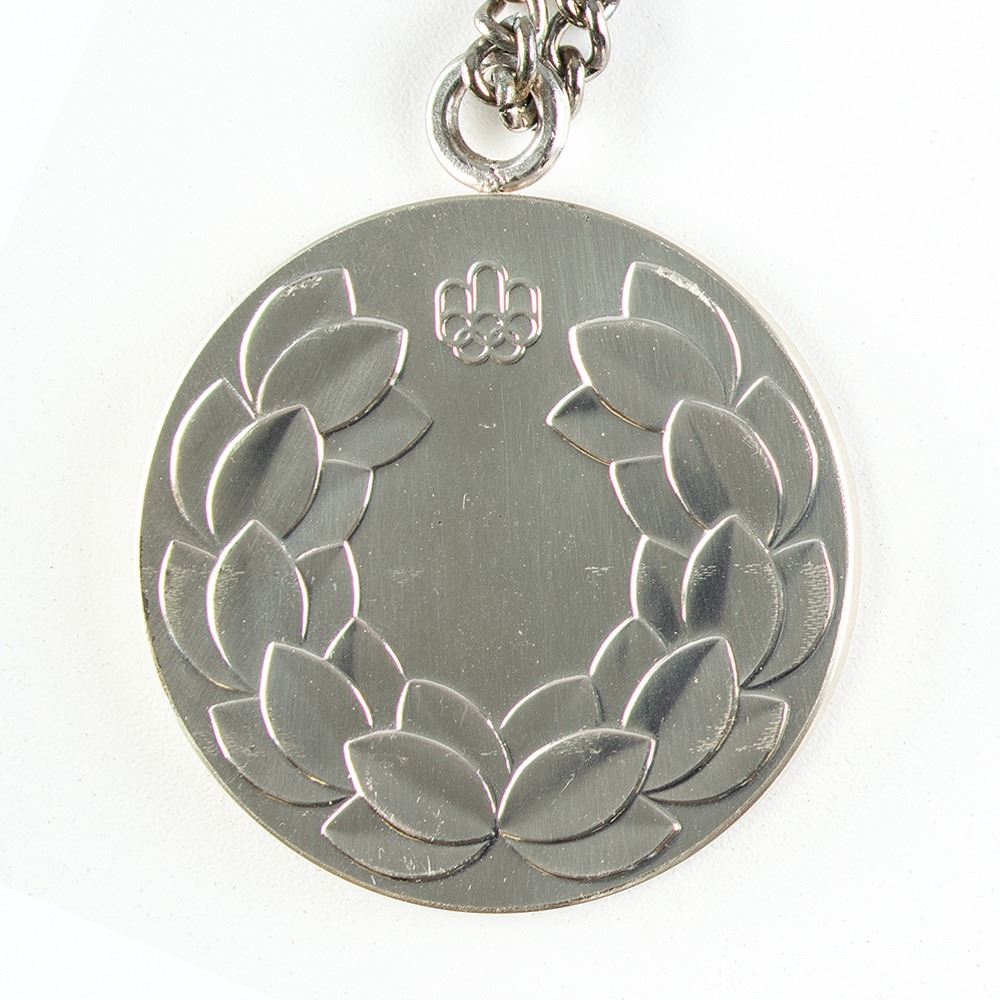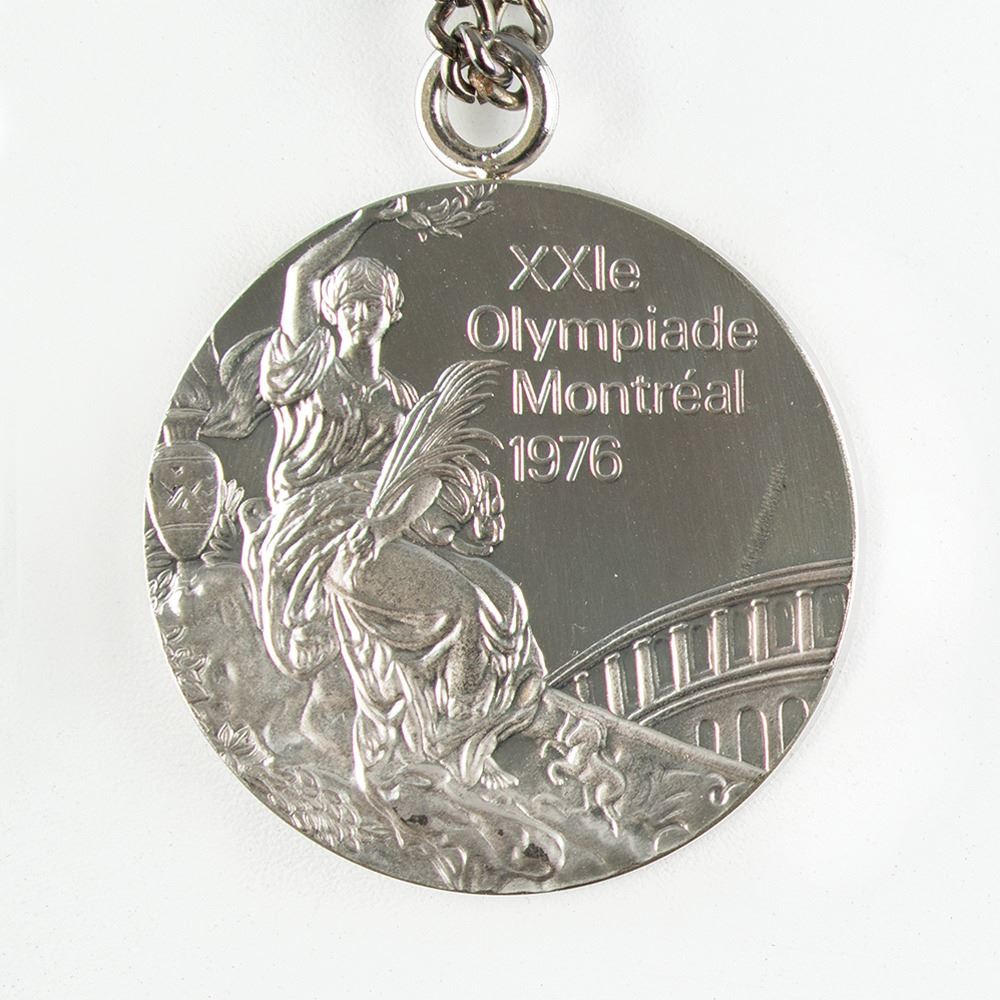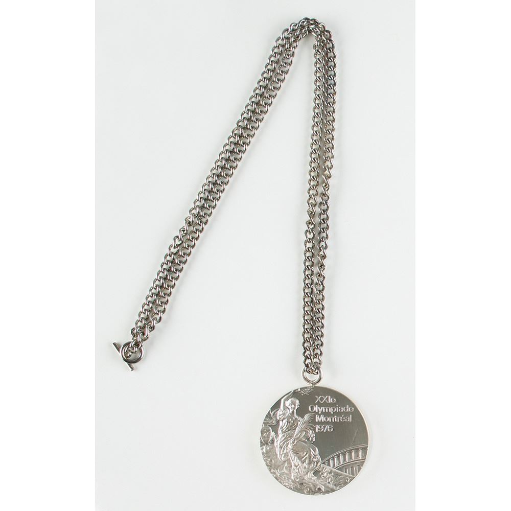 Unawarded winner's medal issued for the Montreal 1976 Summer Olympics. Silver, 60 mm, 154 gm, by Giuseppe Cassioli, Ottawa. The front, inscribed, "XXIe Olympiade Montreal 1976," features a 'Seated Victory' with the Coliseum in the background; the reverse features the Montreal Olympic emblem and victor's laurel wreath. The edge, which would normally feature the engraved name of the event, remains blank. The medal bears a few areas of light scuffing to finish. Includes the original silver chain and rare wooden case with black leather slipcover embossed with a silver Montreal Games emblem. There were only 364 silver winner's medals produced for the Montreal 1976 Games.