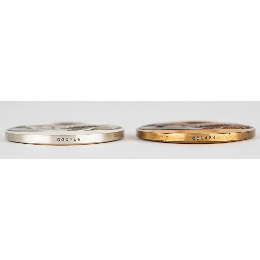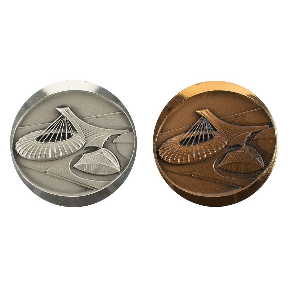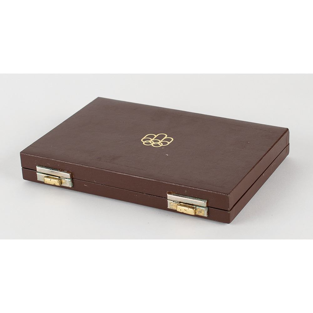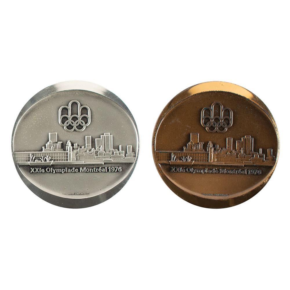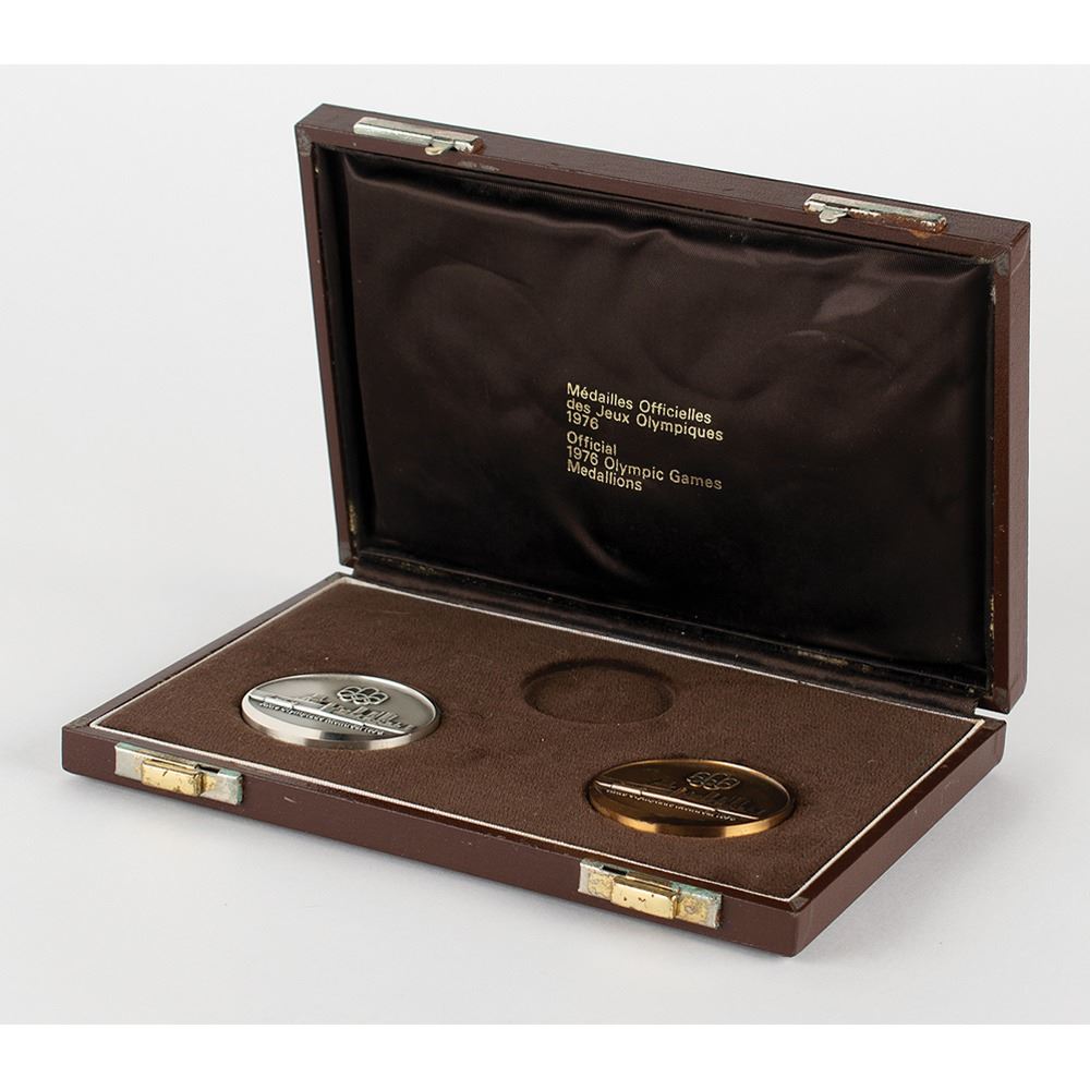 Limited edition set containing sterling silver and bronze medallions issued for the Montreal 1976 Summer Olympics. Both medallions are 51 mm in diameter and are numbered on the edge, “000464.†The front of the medallions show the skyline of Montreal with official logo above and text below: “XXIe Olympiade Montreal 1976â€; and the reverse feature an aerial view of Olympic Stadium or ‘Big O.’ The silver medallion weighs 69 gm, and the bronze weighs 57 gm. Includes the original brown leather presentation case with Montreal logo to upper lid; the case bears various marks and scuffs, most notably to the underside. The gold medallion is not included.