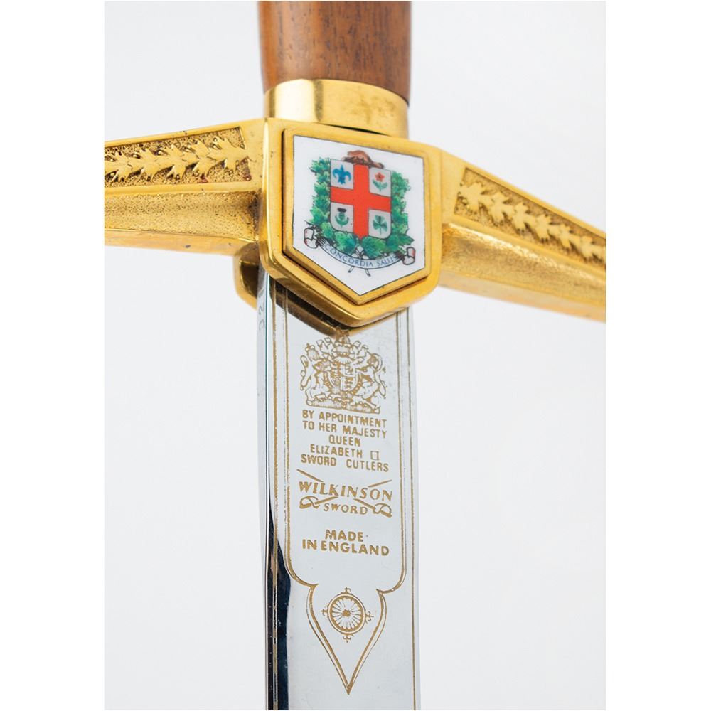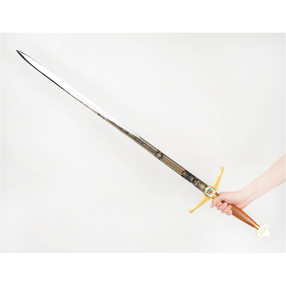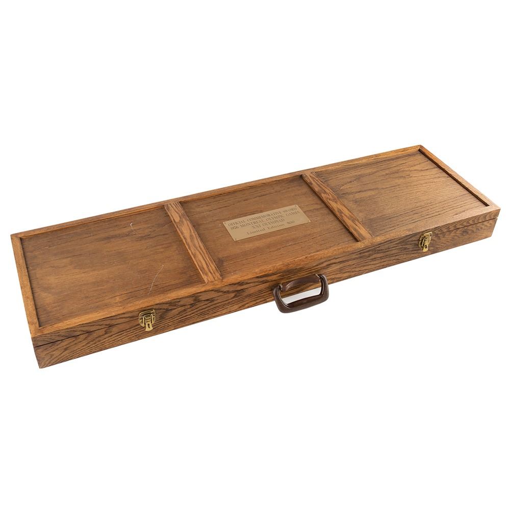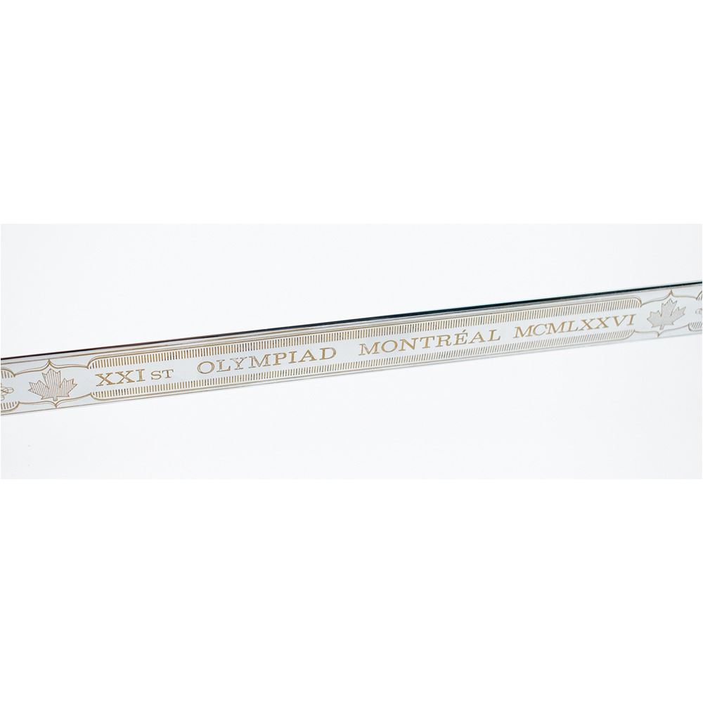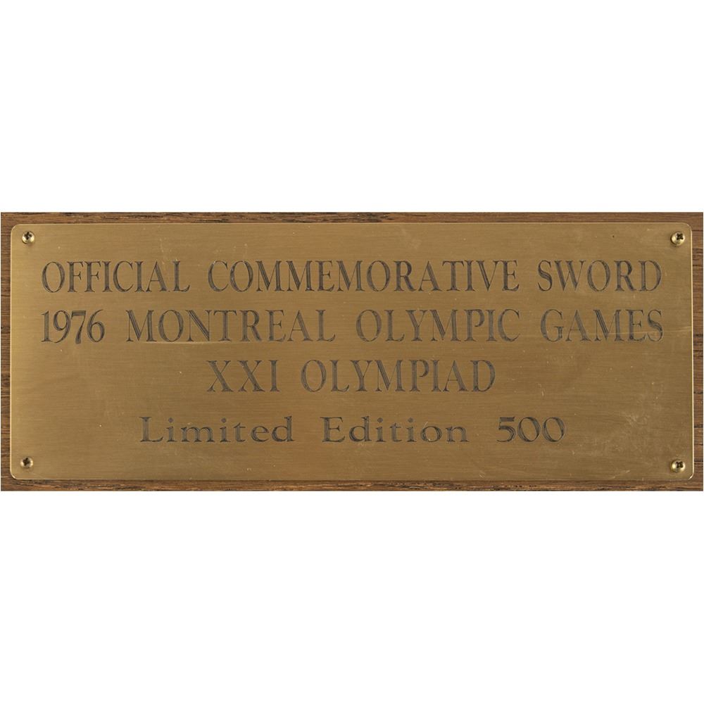 Limited edition official ceremonial Wilkinson sword made for the Montreal 1976 Summer Olympics. The cross-guard measures 8″ and the sword measures 44.25″ in length from tip to pommel. The blade is handsomely engraved on one side with a pair of eleven-point Canadian maple leaves and the text, “XXIst Olympiad Montreal MCMLXXVIâ€; the area nearest the hilt bears the Wilkinson Sword logo and reads: “By appointment of Her Majesty Queen Elizabeth II, Sword Cutlers, Made in England.†The center of the hilt features the coast of arms of the city of Montreal (opposite side does not include the same enamel design), and the pommel end is cast in the shape of a Canadian maple leaf with engraved Olympic rings. The edge of the blade is engraved with the number, “021.†Includes the original wooden carrying case, 45.5Ë x 13.75Ë x 3.75Ë, with engraved upper plate that reads: “Official Commemorative Sword, 1976 Montreal Olympic Games, XXI Olympiad, Limited Edition 500.†Seldom offered for sale, these impressive swords were presented to dignitaries from each country present at the Montreal Olympics games, as well as to select IOC committee members.