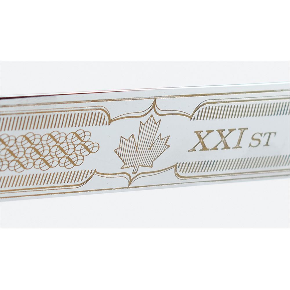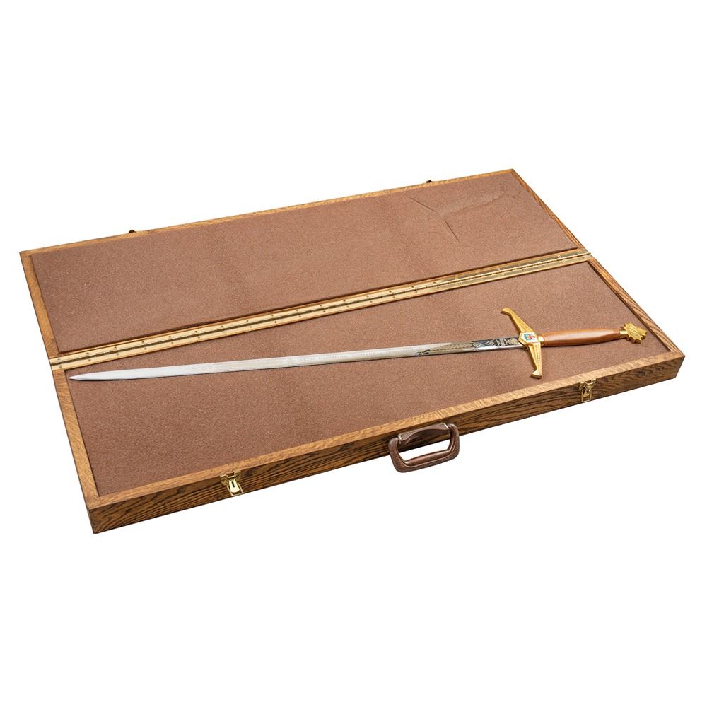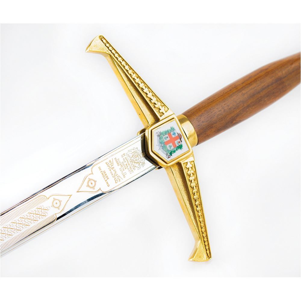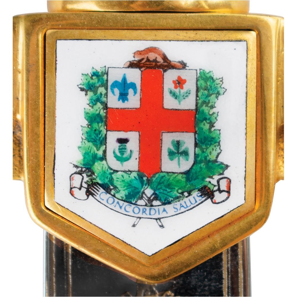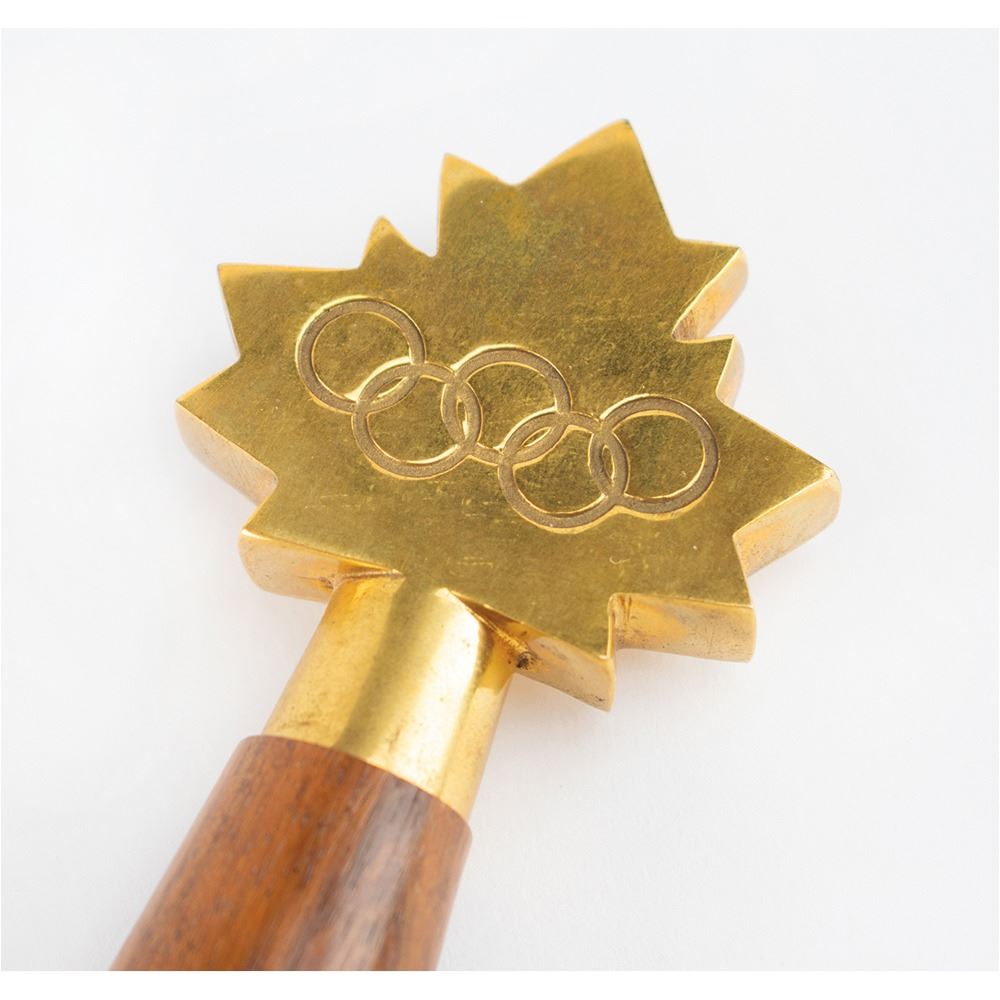 Limited edition official ceremonial Wilkinson sword made for the Montreal 1976 Summer Olympics. The cross-guard measures 8″ and the sword measures 44.25″ in length from tip to pommel. The blade is handsomely engraved on one side with a pair of eleven-point Canadian maple leaves and the text, “XXIst Olympiad Montreal MCMLXXVIâ€; the area nearest the hilt bears the Wilkinson Sword logo and reads: “By appointment of Her Majesty Queen Elizabeth II, Sword Cutlers, Made in England.†The center of the hilt features the coast of arms of the city of Montreal (opposite side does not include the same enamel design), and the pommel end is cast in the shape of a Canadian maple leaf with engraved Olympic rings. The edge of the blade is engraved with the number, “021.†Includes the original wooden carrying case, 45.5Ë x 13.75Ë x 3.75Ë, with engraved upper plate that reads: “Official Commemorative Sword, 1976 Montreal Olympic Games, XXI Olympiad, Limited Edition 500.†Seldom offered for sale, these impressive swords were presented to dignitaries from each country present at the Montreal Olympics games, as well as to select IOC committee members.