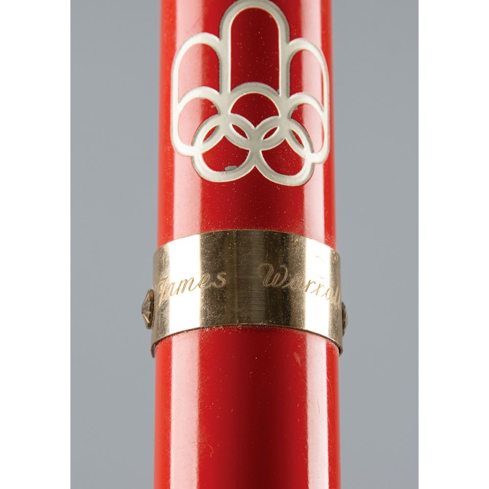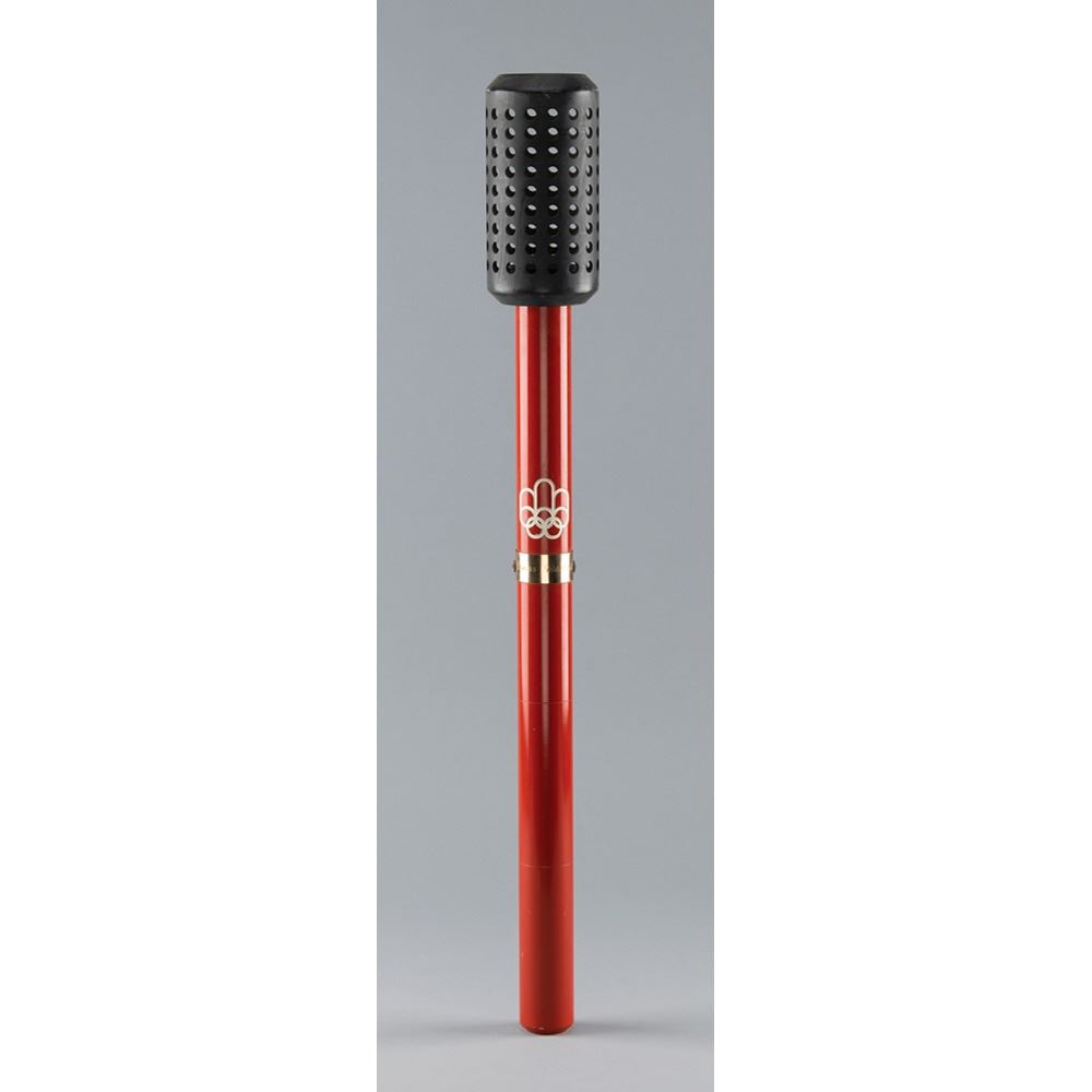 Official 1976 Montreal Olympics torch that was presented to Canadian Olympic administrator James Worrall. Comprised of aluminum and designed by Georges Huel and Michel Daillaire, the torch measures 26″ in length and 3″ at its widest point. The simple yet distinct torch consists of a red handle emblazoned with the Montreal Olympics emblem, below which is an affixed plate engraved with Worrall’s name. The upper 'basket' used to carry the flame was colored black so as to make the flame stand out more prominently. The torch exhibits minimal scuffs and traces of wear. About 1,200 torchbearers participated in the relay, which lasted just four days from July 13 to July 17, and covered 775 km.