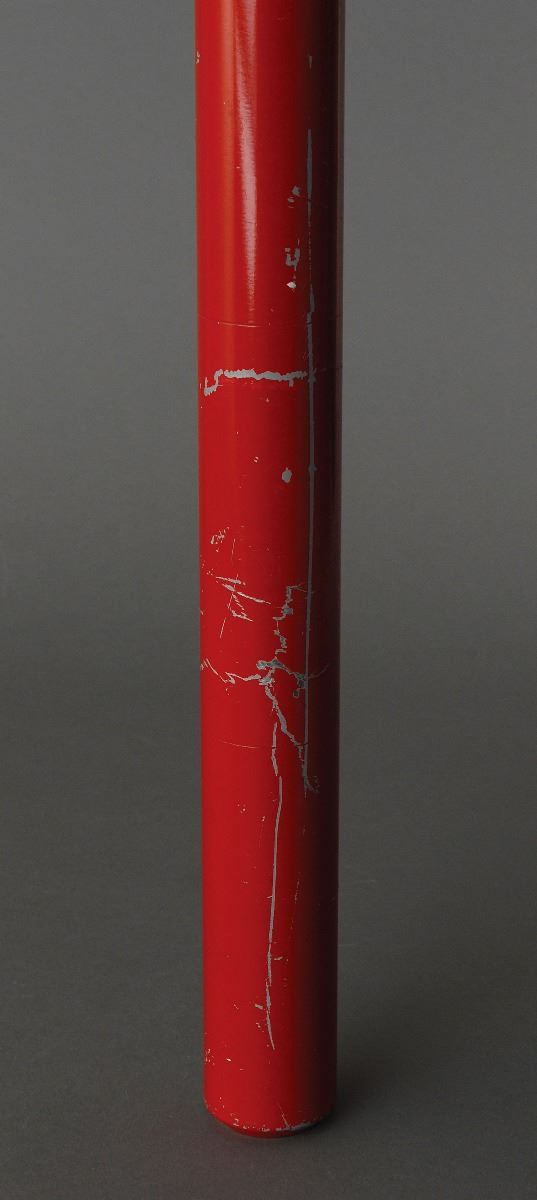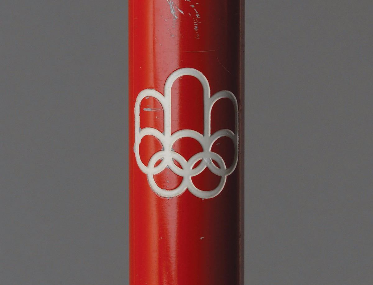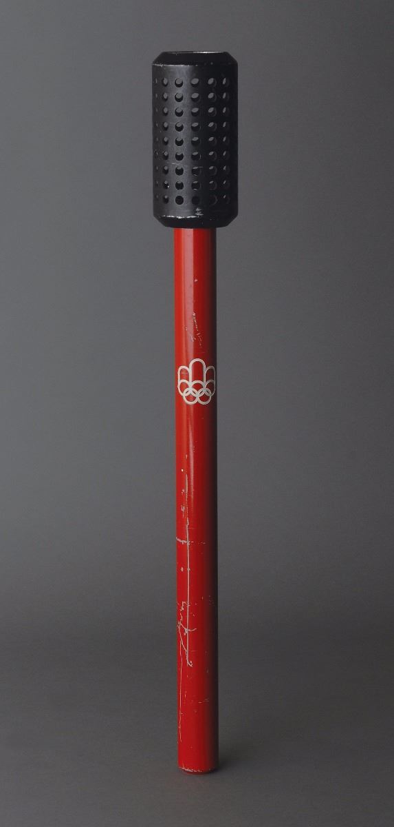 Official 1976 Montreal Olympics torch, comprised of aluminum, measuring 26? in length and 3? at its widest point, designed by Georges Huel and Michel Daillaire. The simple yet distinct torch consists of a red handle emblazoned with the Montreal Olympics emblem, and a black ‘basket’ to carry the flame; the black color on top was intended to make the flame stand out. Exhibits numerous nicks and scuffs to the handle. About 1,200 torchbearers participated in the relay, which lasted just four days from July 13 to July 17 and covered 775 km.