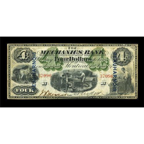 <B>Montreal, CE- The Mechanics Bank</B></I> $4 June 1, 1872 Ch. # 430-10-04c<BR> This short lived bank was established in 1865 and failed in 1879, dogged by reports of corruption by its officers. Its failure was so complete that the bank's notes were redeemed at only 57.5 cents on the dollar, even after assessing its shareholders the full double liability they were responsible for under the law. The Charlton catalogue notes that "Notes of this bank are uncommon in all grades; they are very scarce in Fine or better condition." This is an attractive piece which comes from the only issue of this institution. Bright <B>Fine-Very Fine,</B></I> with a vivid blue "Beauharnois" overprint.<BR><I>From The Thomas M. Flynn Collection</B></I><BR><BR><b>Shipping:</b> Coins & Currency (<a target="_blank" href="http://www.heritageauctions.com/common/shipping.php">view shipping information</a>)
