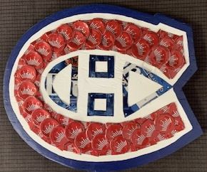 One of a kind artwork from Saskatchewan based Studio 1911 Creations! Each cap is flattened and cut by hand and then secured to plywood with finishing nails. The plywood is painted and sealed on the back. Front is sprayed with rust inhibitor. Piece measures approximately 10x10.