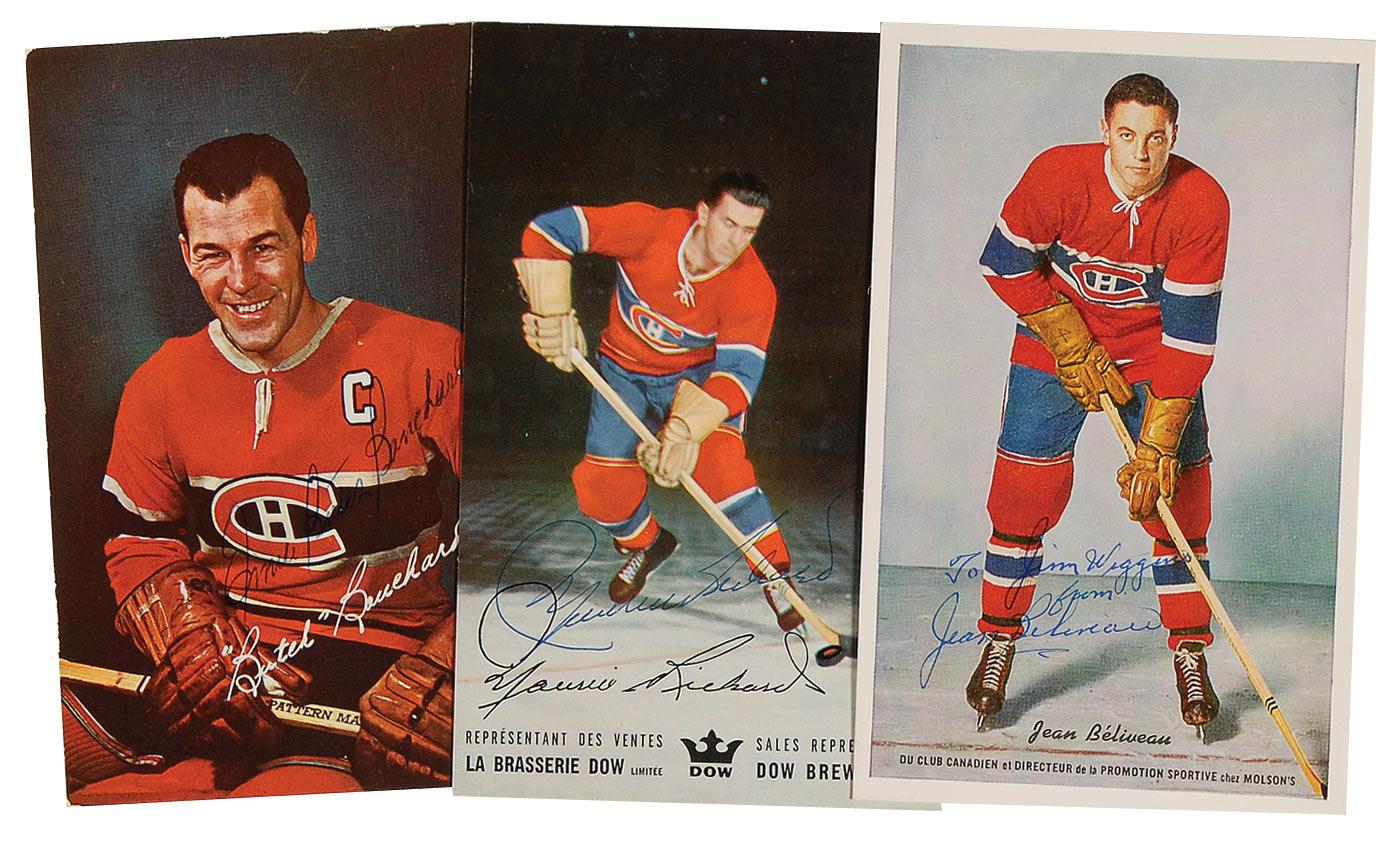 Three color postcard photos, all 3.5 x 5.5, each signed in blue ballpoint by the respective player pictured. Signers are: Jean Beliveau (ins), Maurice Richard, and Butch Bouchard. In overall fine condition.