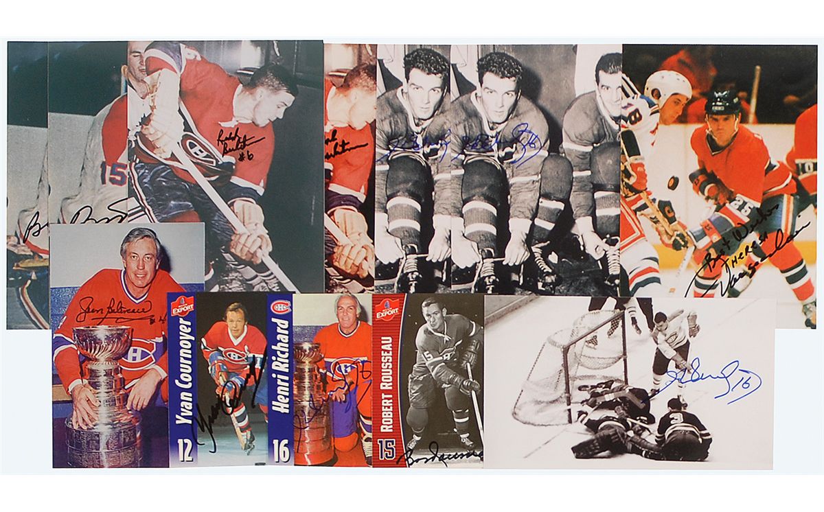 Twelve items consisting of signed photos and trading cards, ranging in size from 2.5 x 4 up to 4 x 6, each signed in felt tip by the respective Montreal Hall of Famer pictured. Signers are: Robert Rousseau (3), Jacques Lemaire, Yvan Cournoyer, Jean Beliveau, Ralph Backstrom (2), and Henri Richard (4). In fine condition.