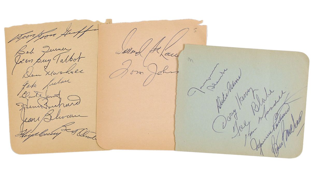Vintage ballpoint signatures of 19 members of the 1955–56 Stanley Cup champion Montreal Canadiens team, on three album pages of approximately 4.5 x 5.5 (none signed back-to-back). Signers are: Jacques Plante, Dickie Moore, Doug Harvey, Toe Blake, Ken Mosdell, Maurice Richard, Butch Bouchard, Bernie ‘Boom Boom’ Geoffrion, Bob Turner, Jean-Guy Talbot, Don Marshall, Jackie Leclair, Claude Provost, Henri Richard, Jean Beliveau, Floyd Curry, Bert Olmstead, Dollard St. Laurent, and Tom Johnson. In overall fine condition, with toning to borders. A fantastic set of signatures featuring all eleven Hall of Famers from the team.