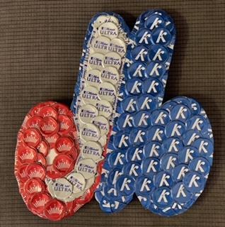 One of a kind artwork from Saskatchewan based Studio 1911 Creations! Each cap is flattened and cut by hand and then secured to plywood with finishing nails. The plywood is painted and sealed on the back. Front is sprayed with rust inhibitor. Piece measures approximately 10x10.