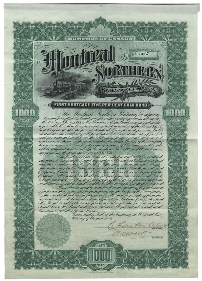 1903, Canada. $1000 First Mortgage 5% Gold Bond. Green/Black. Vignette of a steam locomotive departing a station. Two full pages of attached coupons. Uncancelled and very fine.