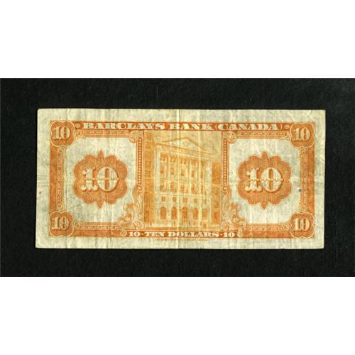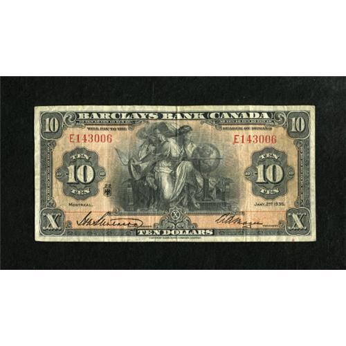 <B>Montreal, ON- Barclays Bank Canada</B></I> $10 Jan. 2, 1935 Charlton 30-12-08 <BR> Uniform circulation defines this <B>Fine</B></I> note.<BR><I>From The Walla Walla Collection</B></I><BR><BR><b>Shipping:</b> Coins & Currency (<a target="_blank" href="http://www.heritageauctions.com/common/shipping.php">view shipping information</a>)