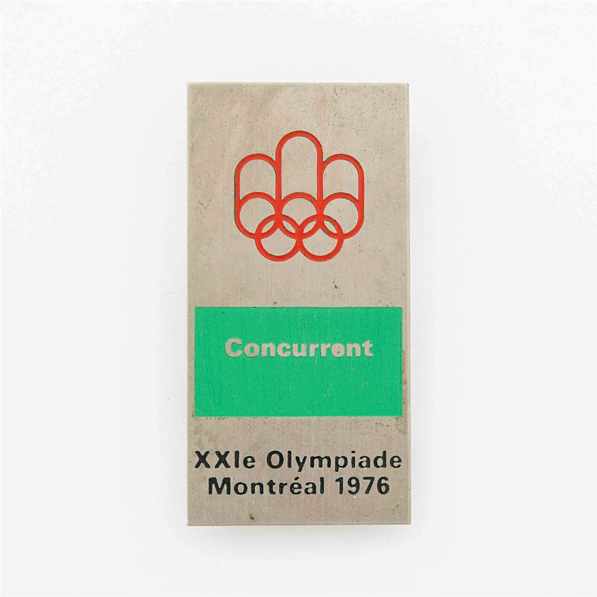 Participant pin from the 1976 Summer Olympics held in Montreal, Canada. Pin measures approximately 1.25 x 2.25, with elongated Olympic rings at the top, “Concurrent,” printed in the middle, and “XXIe Olympiade, Montreal 1976,” at the bottom. Scattered light surface wear, otherwise fine condition.