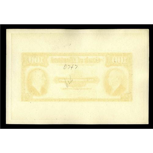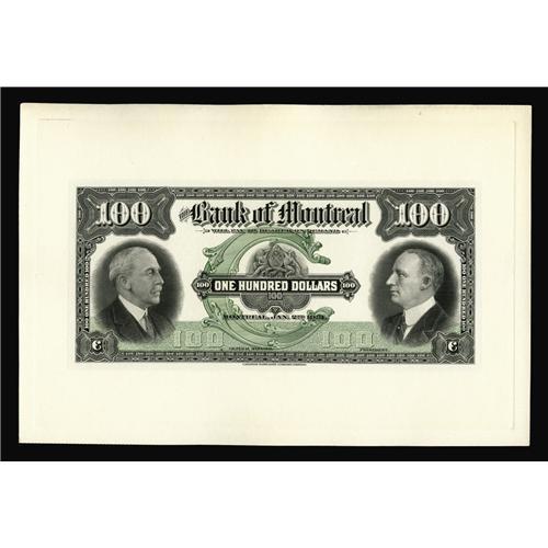<B>Montreal, PQ- Bank of Montreal</B></I> $100 Jan. 2, 1931 Charlton 505-58-10P Face Proof<BR>Charlton does not list proofs for the 1931 issue by this bank. Pencilled control numbers are found on the back of this example that is mounted on card stock. A beautiful proof worthy of a great collection. <B>Gem Crisp Uncirculated.</B></I>