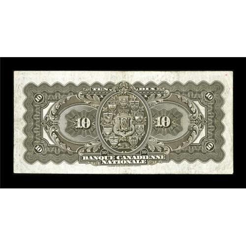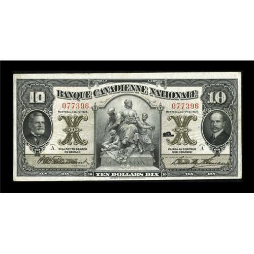 <B>Montreal, PQ- Banque Canadienne Nationale</B></I> $10 Feb. 1, 1925 Ch. # 85-10-04<BR> This institution was created in 1924 as a result of the merger between La Banque Nationale of Quebec City and Banque d'Hochelaga of Montreal. The new bank was titled Banque Canadienne Nationale and was successful from the outset, paying off the loan from the Province of Quebec that made the consolidation possible in twenty rather than the previously agreed forty years. The first four notes offered here are from the bank's initial issue, which is dated February 1, 1925. <B>Extremely Fine.</B></I><BR><I>From The Thomas M. Flynn Collection</B></I><BR><BR><b>Shipping:</b> Coins & Currency (<a target="_blank" href="http://www.heritageauctions.com/common/shipping.php">view shipping information</a>)