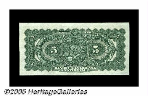 <B>Montreal, PQ- Banque Canadienne Nationale</B></I> $5 Feb. 1, 1925 Ch. 85-10-02<BR>A crackling-fresh and fully embossed example of this very pretty note, Gem but for the lightest of handling. <B>Choice Crisp Uncirculated.</B></I>