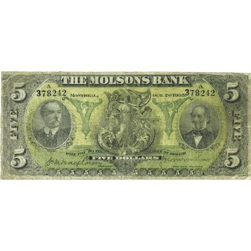<B>Montreal, PQ- Molsons Bank</B></I> $5 Oct. 2, 1905 Ch. 490-28-04<BR>A repair is noticed on the back of this scarce note. <B>Very Good.</B></I><BR><I>From The Halton Lake Collection</B></I>