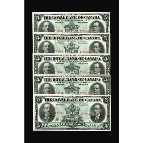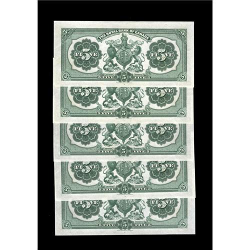<B>Montreal, PQ- Royal Bank of Canada</B></I> $5 Jan. 2, 1913 Ch. 630-12-04. Five Consecutive Examples.<BR>Original paper surfaces on this crackling fresh quintet, with two staple holes to mention in each note at upper left. <B>Choice Crisp Uncirculated</B></I>.<BR><I>From The Halton Lake Collection</B></I>