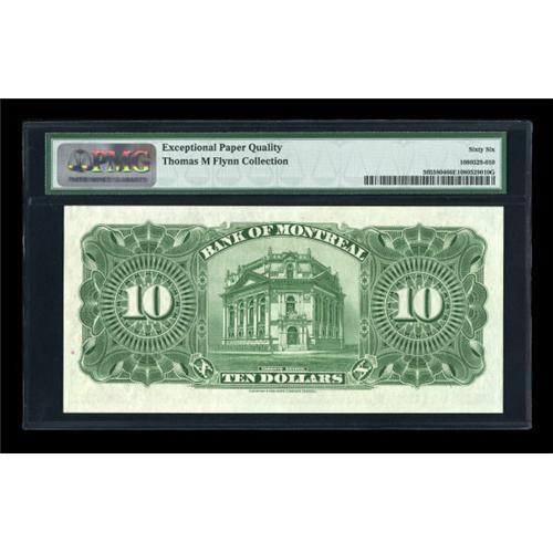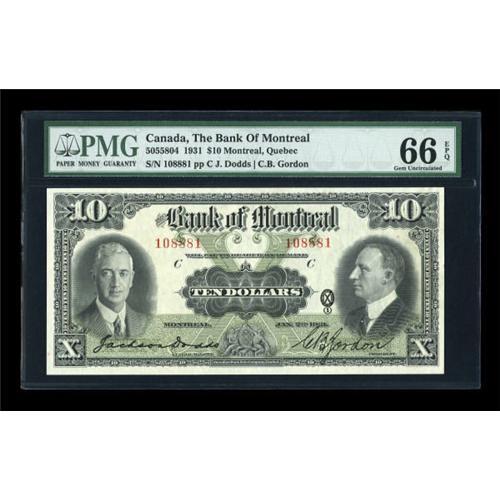 <B>Montreal, PQ- The Bank of Montreal</B></I> $10 Jan. 2, 1931 Ch. # 505-58-04<BR> The Charlton reference notes that The Bank of Montreal $10 1931 is perhaps the most readily available of all large size chartered bank notes in uncirculated condition. That might well be true, but few of the uncirculated examples are likely to be as nice as this specimen, which is hugely margined and as fresh as the day it left the press. PMG <B>Gem Uncirculated 66 EPQ.</B></I><BR><I>From The Thomas M. Flynn Collection</B></I><BR><BR><b>Shipping:</b> Coins & Currency (<a target="_blank" href="http://www.heritageauctions.com/common/shipping.php">view shipping information</a>)