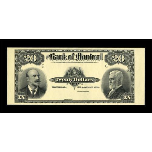 <B>Montreal, PQ- The Bank of Montreal</B></I> $20 Jan. 3, 1911 Ch. # 505-50-04P Face Proof<BR> Ample margins and embossed card stock are merits of this Proof<B>. Gem Crisp Uncirculated</B></I>.<BR><BR><b>Shipping:</b> Coins & Currency (<a target="_blank" href="http://www.heritageauctions.com/common/shipping.php">view shipping information</a>)