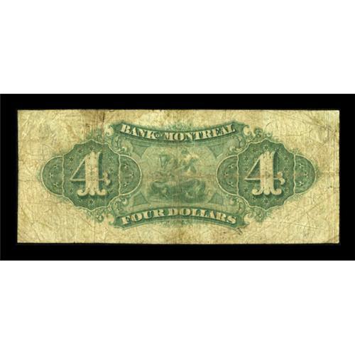 <B>Montreal, PQ- The Bank of Montreal</B></I> $4 Feb. 6, 1871 Ch. # 505-34-02<BR> The issue of 1871 was the first from The Bank of Montreal since confederation in 1867, with the $4 note representing the lowest denomination the bank could now issue, the issuance of denominations below that amount having been reserved to the Federal Government. This is an exceedingly rare note in all grades, and is priced only from Good through Fine in Charlton. <B>Very Good+.</B></I><BR><I>From The Thomas M. Flynn Collection</B></I><BR><BR><b>Shipping:</b> Coins & Currency (<a target="_blank" href="http://www.heritageauctions.com/common/shipping.php">view shipping information</a>)