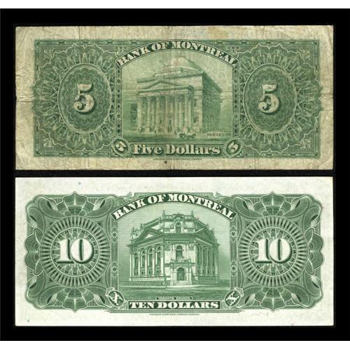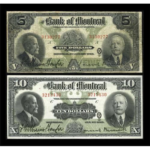 <B>Montreal, PQ- The Bank of Montreal</B></I> $5, $10 Jan. 2, 1923 Ch. # 505-56-02, 505-56-04<BR> Two pieces from the 1923 issue, the $5 <B>Very Good-Fine, </B></I>the $10 <B>Extremely Fine+,</B></I> with the appearance of a new note until closely examined. <BR><I>From The Thomas M. Flynn Collection</B></I><BR><BR><b>Shipping:</b> Coins & Currency (<a target="_blank" href="http://www.heritageauctions.com/common/shipping.php">view shipping information</a>)