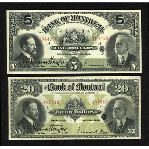 <B>Montreal, PQ- The Bank of Montreal</B></I> $5, $20 Nov. 3, 1914 Ch. # 505-54-04, 505-54-12<BR> Two pieces from this long lived issue, with the $5 grading <B>Very Fine+</B></I> and the $20 <B>Fine-Very Fine.</B></I><BR><I>From The Thomas M. Flynn Collection</B></I><BR><BR><b>Shipping:</b> Coins & Currency (<a target="_blank" href="http://www.heritageauctions.com/common/shipping.php">view shipping information</a>)