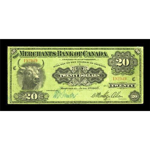 <B>Montreal, PQ- The Merchants Bank of Canada</B></I> $20 June 1, 1907 Ch. 460-16-06<BR> A very scarce note featuring a full green tint and a neat steer's head vignette. <B>About Fine.<BR></B></I><I>From The John Ameen Collection</B></I><BR><BR><b>Shipping:</b> Coins & Currency (<a target="_blank" href="http://www.heritageauctions.com/common/shipping.php">view shipping information</a>)