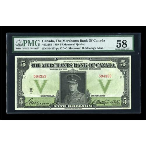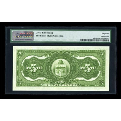 <B>Montreal, PQ- The Merchants Bank of Canada</B></I> $5 Nov. 1, 1919 Ch. # 460-22-02<BR> This is a very scarce note in all grades, and a just plain rare note in this state of preservation. PMG <B>Choice About Uncirculated 58, </B></I>with the notation on the holder "Great Embossing." It should be mentioned that this is the sole example of this note that PMG has graded in any grade.<BR><I>From The Thomas M. Flynn Collection</B></I><BR><BR><b>Shipping:</b> Coins & Currency (<a target="_blank" href="http://www.heritageauctions.com/common/shipping.php">view shipping information</a>)