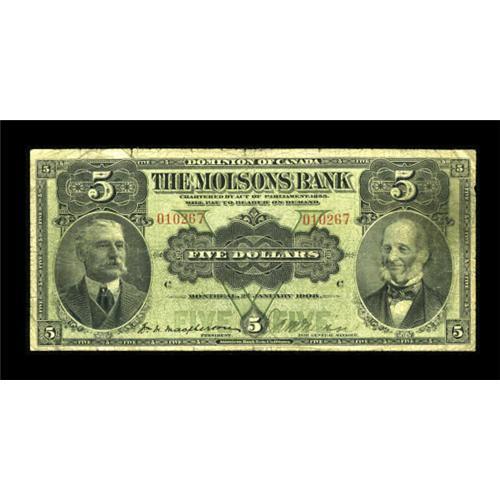 <B>Montreal, PQ- The Molsons Bank</B></I> $5 Jan. 2, 1908 Ch. 490-30-02<BR> Another scarce note from this well collected bank. <B>About Fine,</B></I> with a couple of minor splits at the top margin. <BR><BR><b>Shipping:</b> Coins & Currency (<a target="_blank" href="http://www.heritageauctions.com/common/shipping.php">view shipping information</a>)