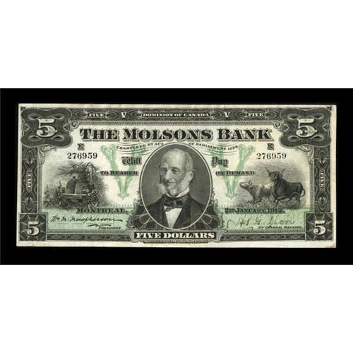 Montreal, PQ- The Molsons Bank $5 Jan. 2, 1912