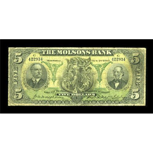 Montreal, PQ- The Molsons Bank $5 Oct. 2, 1905