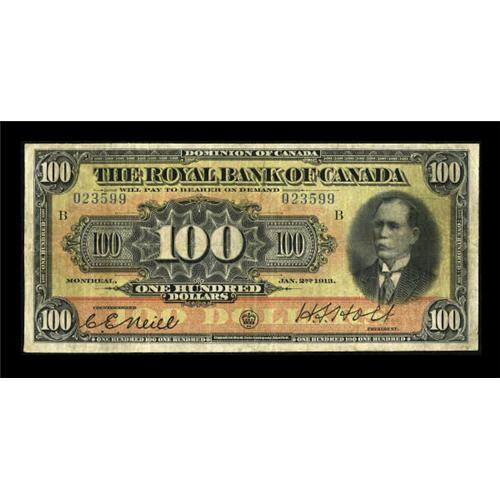 <B>Montreal, PQ- The Royal Bank of Canada</B></I> $100 Jan. 2, 1913 Ch. # 630-12-22<BR> The $100 is by far the key denomination in this series, and this example is a nice one, with a multi-color face and a vivid scarlet reverse. <B>Very Fine.</B></I><BR><I>From The Thomas M. Flynn Collection</B></I><BR><BR><b>Shipping:</b> Coins & Currency (<a target="_blank" href="http://www.heritageauctions.com/common/shipping.php">view shipping information</a>)