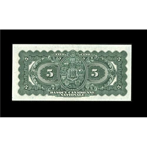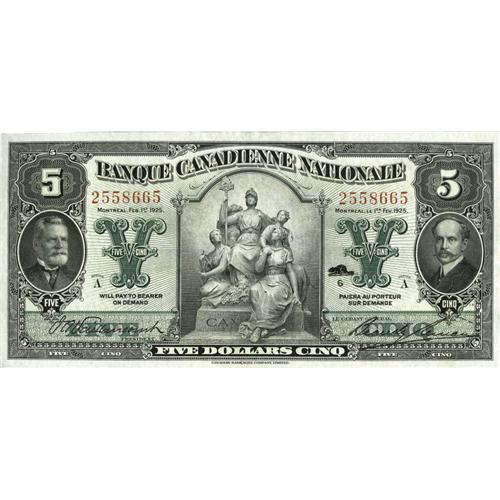<B>Montreal, QC- Banque Canadienne Nationale</B></I> $5 Feb. 1, 1925 Ch.85-10-02<BR>High grade circulating notes on this bank, like this one, are actually much scarcer than their proof and specimen counterparts. <B>Choice Crisp Uncirculated.</B></I><BR><I>From The Halton Lake Collection</B></I>