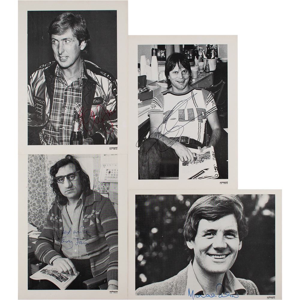Group lot of four glossy Walkerprint photos of Monty Python, 8.25 x 6 and 6 x 8.25, individually signed in ink or felt tip by the pictured comedian: Terry Gilliam, Eric Idle, Michael Palin, and Terry Jones. In overall fine condition.