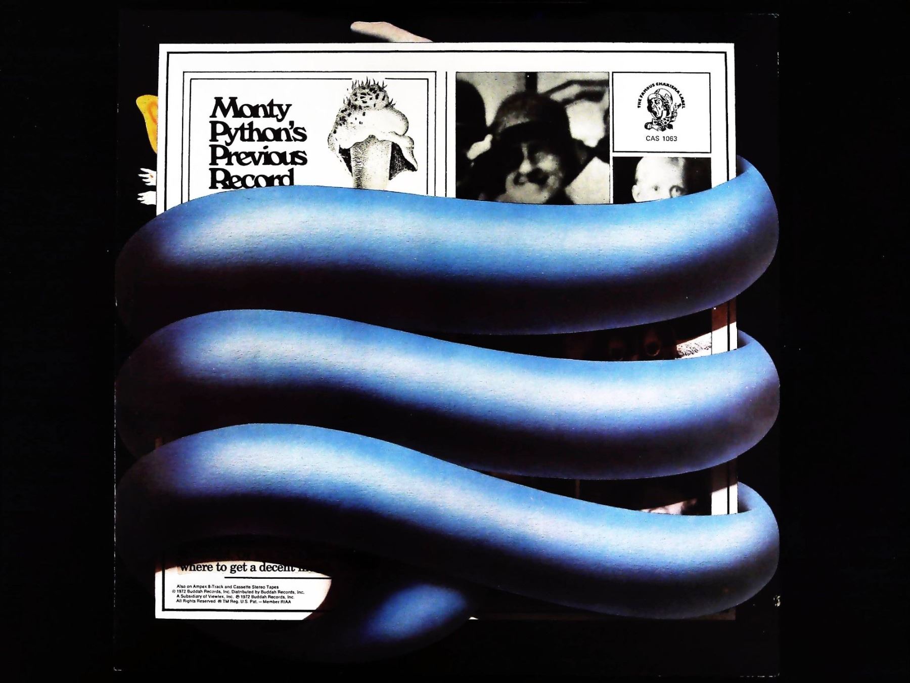 A single 12-inch vinyl LP record, Monty Python's Previous Record, originally released by Charisma Records in 1972. The record is housed in its original illustrated cardboard sleeve featuring surrealist pop-art imagery, depicting a large blue coiled tube and a hand reaching toward a yellow and brown butterfly. The back cover confirms the track listing and the catalog number CAS 1063, noting copyright dates of 1972 by Charisma Records, Inc. The black vinyl disc features the track list for Side A and the identification CAS 1063 on the center label. Dimensions: 12.5" x 12.5"