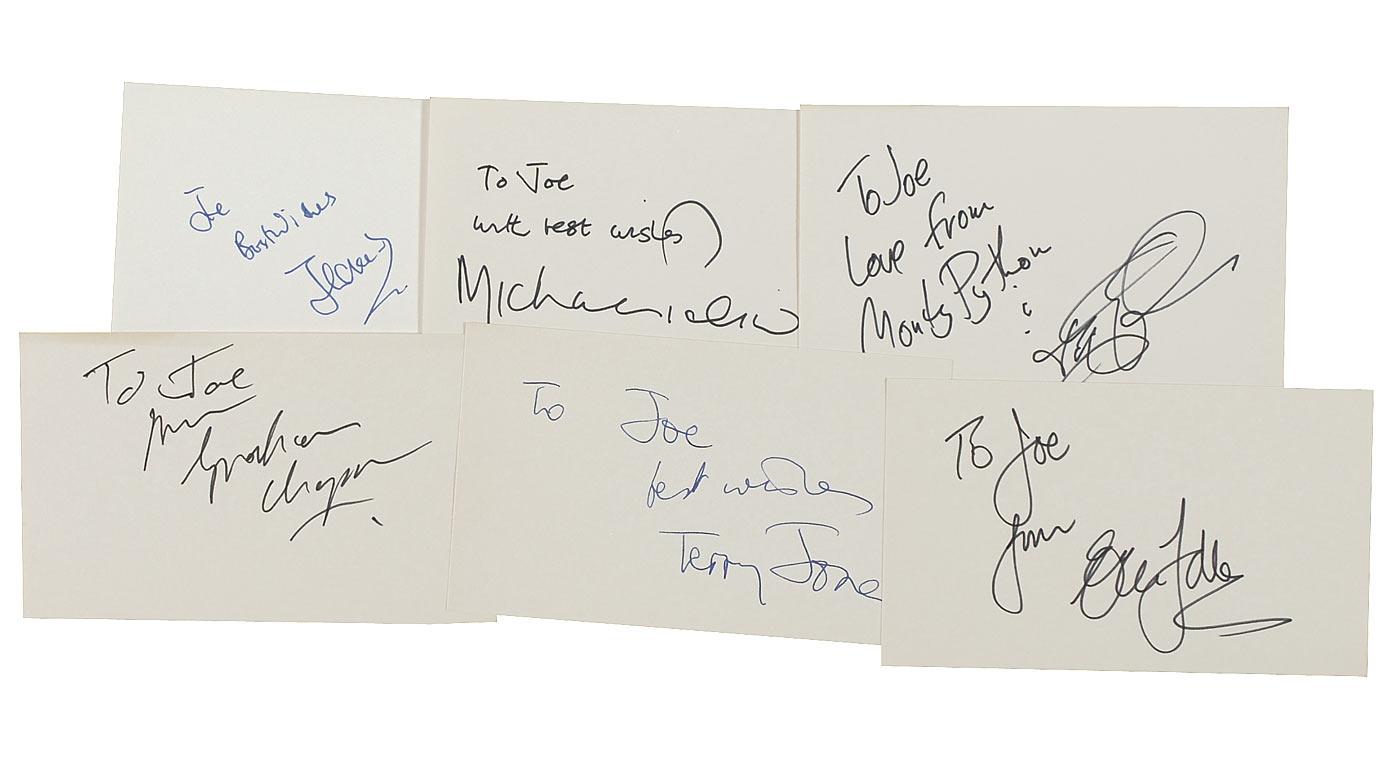 In-person ink and felt tip signatures and inscriptions of Graham Chapman, Michael Palin, Eric Idle, John Cleese, Terry Jones, and Terry Gilliam on individual off-white 5 x 3 cards. In fine condition.