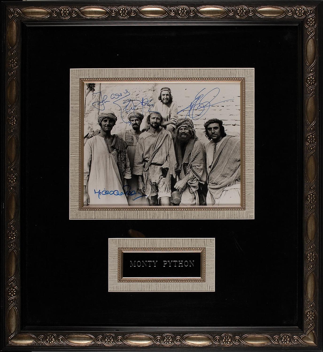 Glossy 10 x 8 portrait of Monty Python on the set of The Life of Brian, signed in blue felt tip by John Cleese, Terry Gilliam, Eric Idle, and Michael Palin. Double suede matted and framed with a descriptive plaque to an overall size of 20 x 22. In fine condition.