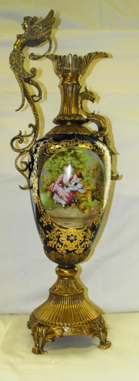A very nice romantic scene porcelain insert ewer. Having dore bronze mounts and figural handle.
