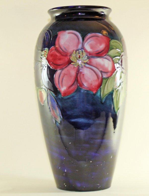 Monumental Moorcroft anemone vase. It is dark blue with wine and purple flowers, cream and wine buds, and green leaves. The glaze has a few tiny pin-head spots where the slip was not completely covered with glaze. There are no chips or cracks. The signature dates to approximately 1920.