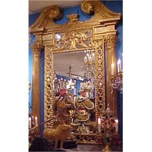 This is an exquisitely carved and water gilded beechwood mirror in the style of the Regency Period of George IV. It's monumental size, architectural elements and exquisitely carved details make it an "Ulra-Luxe" item perfect for the finest interior setting. Truly an item for the connoisseur with an eye for quality and the wallet to go with it!