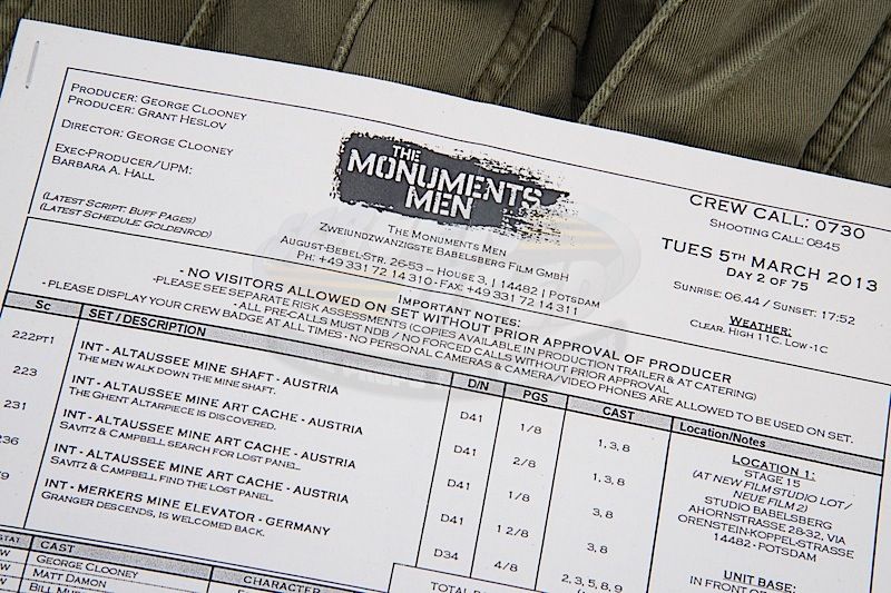 (Columbia Pictures, 2013) Jackets like this were given to various members of the film's crew. The jacket is a size small and features the film's logo patch on the left arm. Included with the jacket is a three page production used call sheet dated March 5th, 2013. The call sheet features the filming requirements of the day's shoot and driving directions to the location.