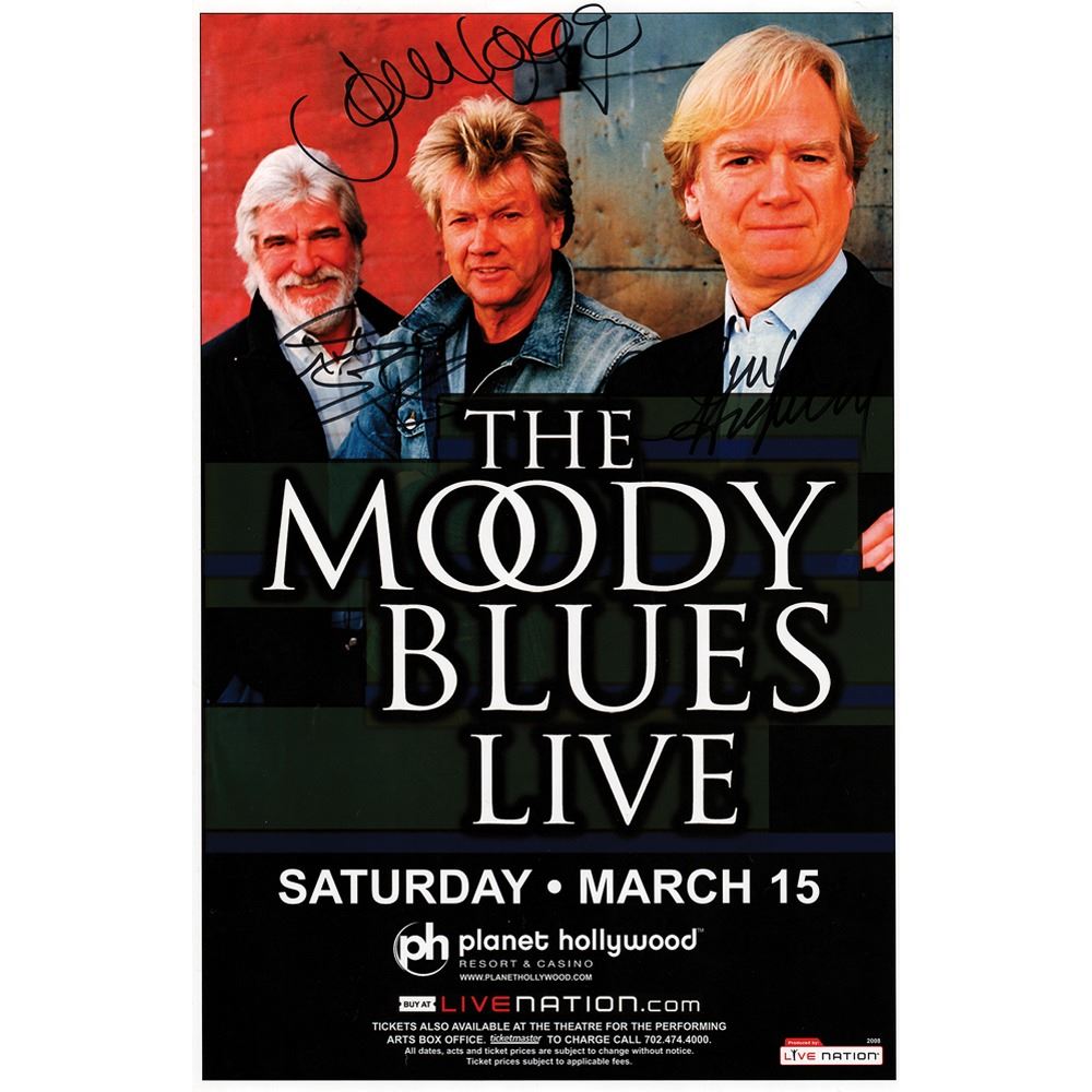 Color 11 x 17 lightweight poster for a concert by The Moody Blues at the Planet Hollywood Theatre for the Performing Arts in Las Vegas, Nevada, on March 15, 2008, signed in black felt tip by Graeme Edge, John Lodge, and Justin Hayward. In very good to fine condition, with creasing to the upper corners. The consignor notes that the autographs were obtained in person.