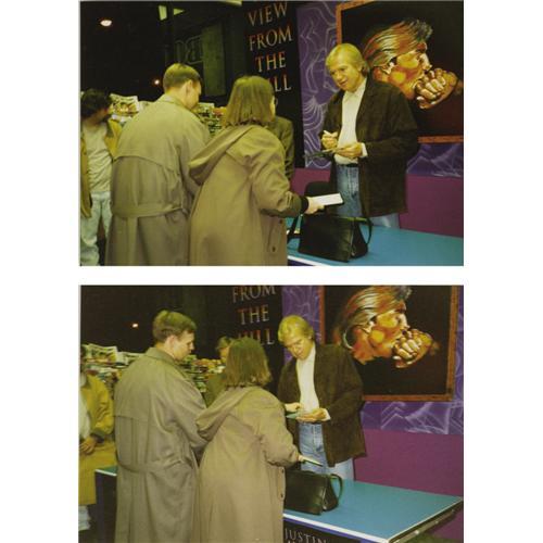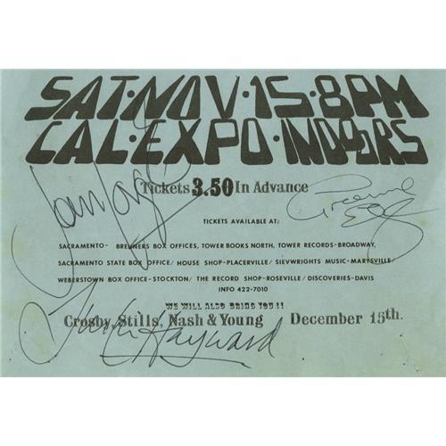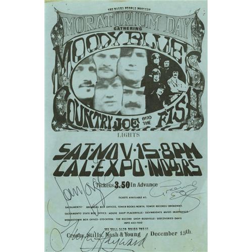 <B>Moody Blues Signed Handbill (1969)</B></I> The Moody Blues were at a career peak in 1969, with a string of hits and several successful albums under their belt. Here's a cool blue 5.5" x 8.5" handbill for their "Moratorium Day Gathering" concert, featuring Country Joe and the Fish as the opening act. This VG flyer was later signed by Justin Hayward, Grahame Edge, and John Lodge. Included with the handbill are three color snapshots of Justin signing and holding the handbill.