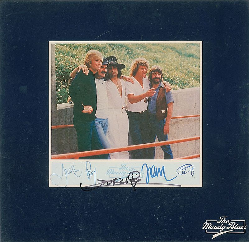 Color Moody Blues calendar for 1983, 12 x 12, signed on the first page in felt tip and ink by Justin Hayward, John Lodge, Graeme Edge, Patrick Moraz, and Ray Thomas, all signing first names only. In fine condition, with separations to vertical edges of holding sleeve.