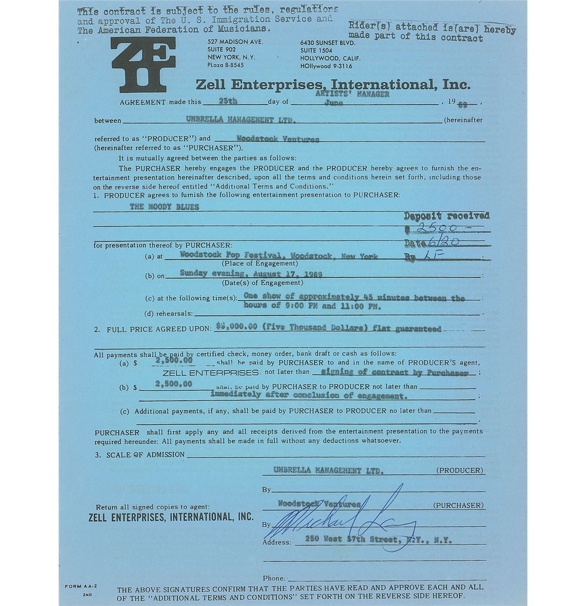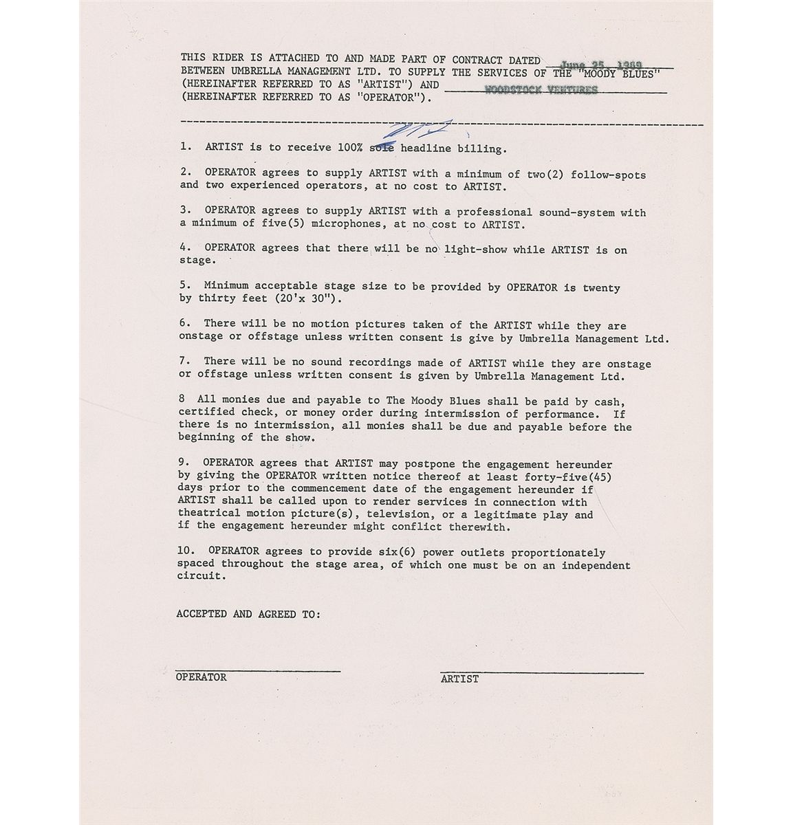 DS, signed “Michael Lang,” one page, 8.5 x 11, June 25, 1969. Zell Enterprises International, Inc. contract between Umbrella Management Ltd. and Woodstock Ventures for the Moody Blues to play at the “Woodstock Pop Festival, Woodstock, New York, on Sunday evening, August 17, 1969.” The band was to play “One show of approximately 45 minutes between the hours of 9:00 PM and 11:00 PM,” in exchange for a flat rate of $5,000. Signed at the conclusion by Michael Lang, a concert promoter who co-created the Woodstock Music & Art Festival. Contract remains unsigned by the band’s management, as they never accepted. While the Moody Blues were advertised on the original Wallkill poster as performers, they backed out after being booked in Paris the same weekend. Two horizontal folds, moderate scattered creases, and staple holes and a small tear to the upper right corner, otherwise fine condition. Accompanied by an unsigned rider for the contract and two original unsigned publicity photos of the band.