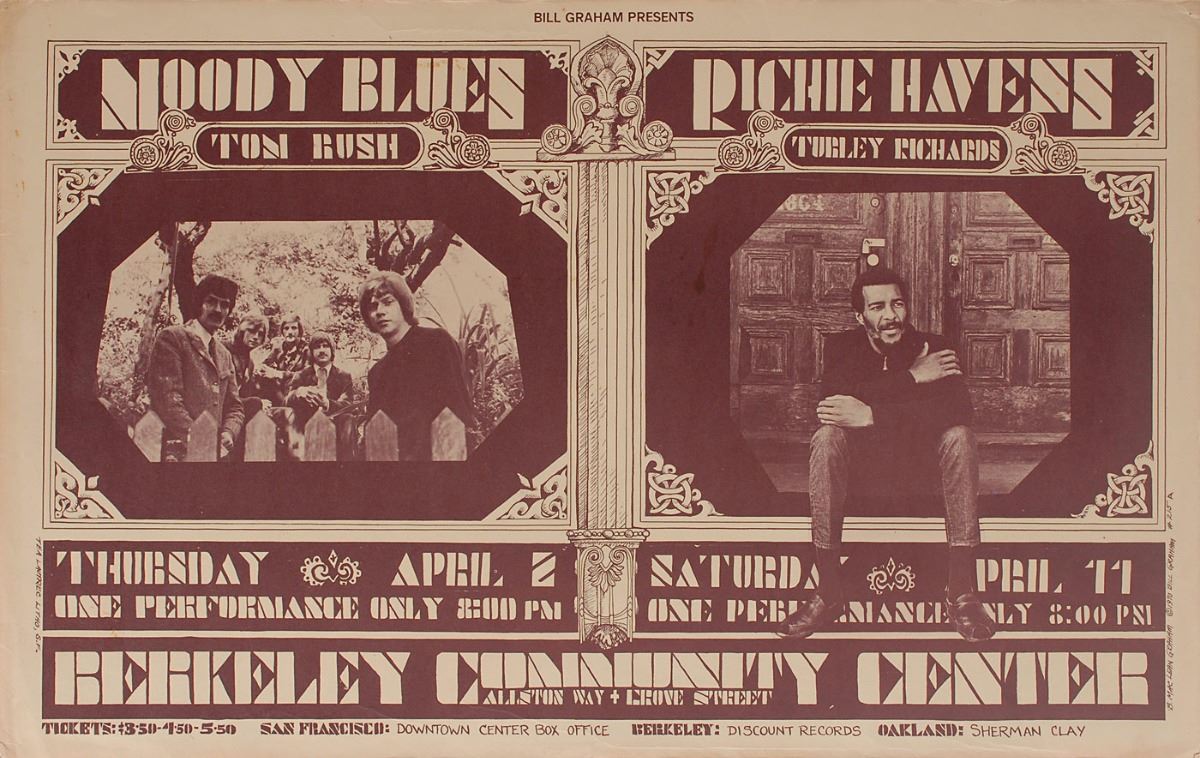 Attractive 22.5 x 14.25 poster promoting Moody Blues and Richie Havens concerts at the Berkeley Community Center on April 8 and 11, 1970, showing images of both artists and listing Tom Rush and Turley Richards as opening acts. Slight scattered soiling, creasing to edges, and tack holes to upper corners, otherwise fine condition.